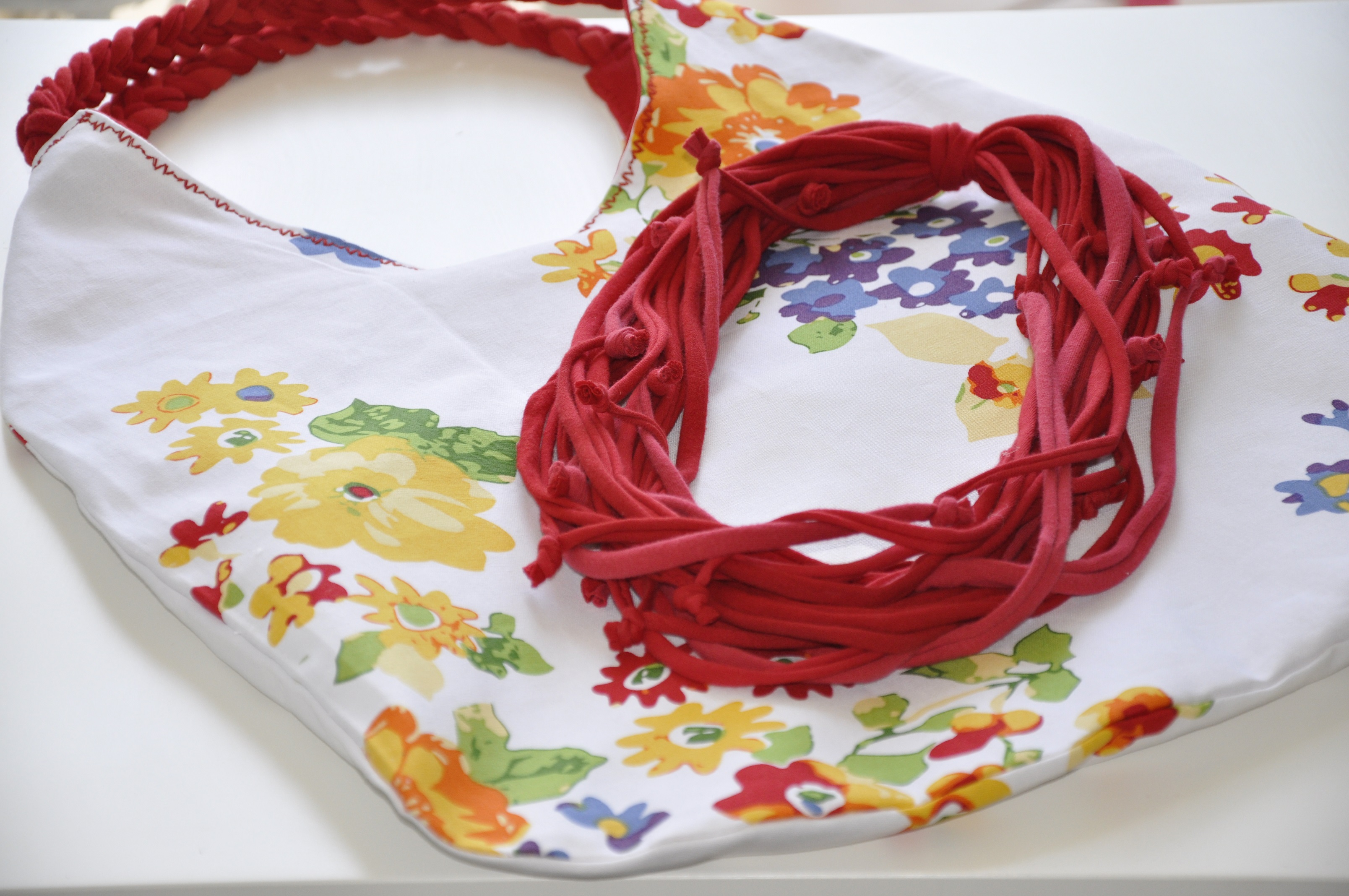Moja propozycja na modyfikację stroju to eko-naszyjnik w włóczki typu zpagetti pozyskanej z t-shirta oraz dwustronna torba 🙂