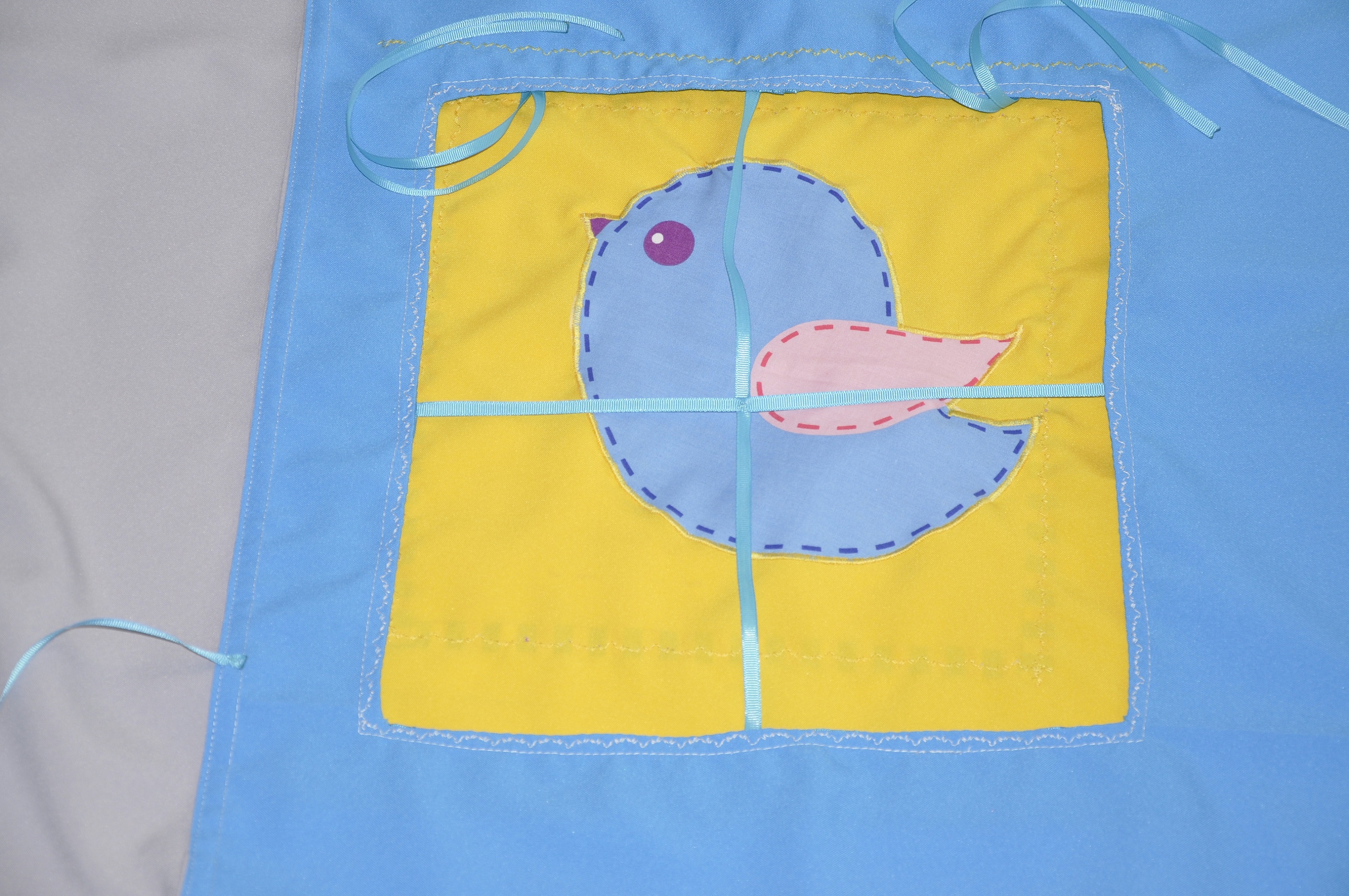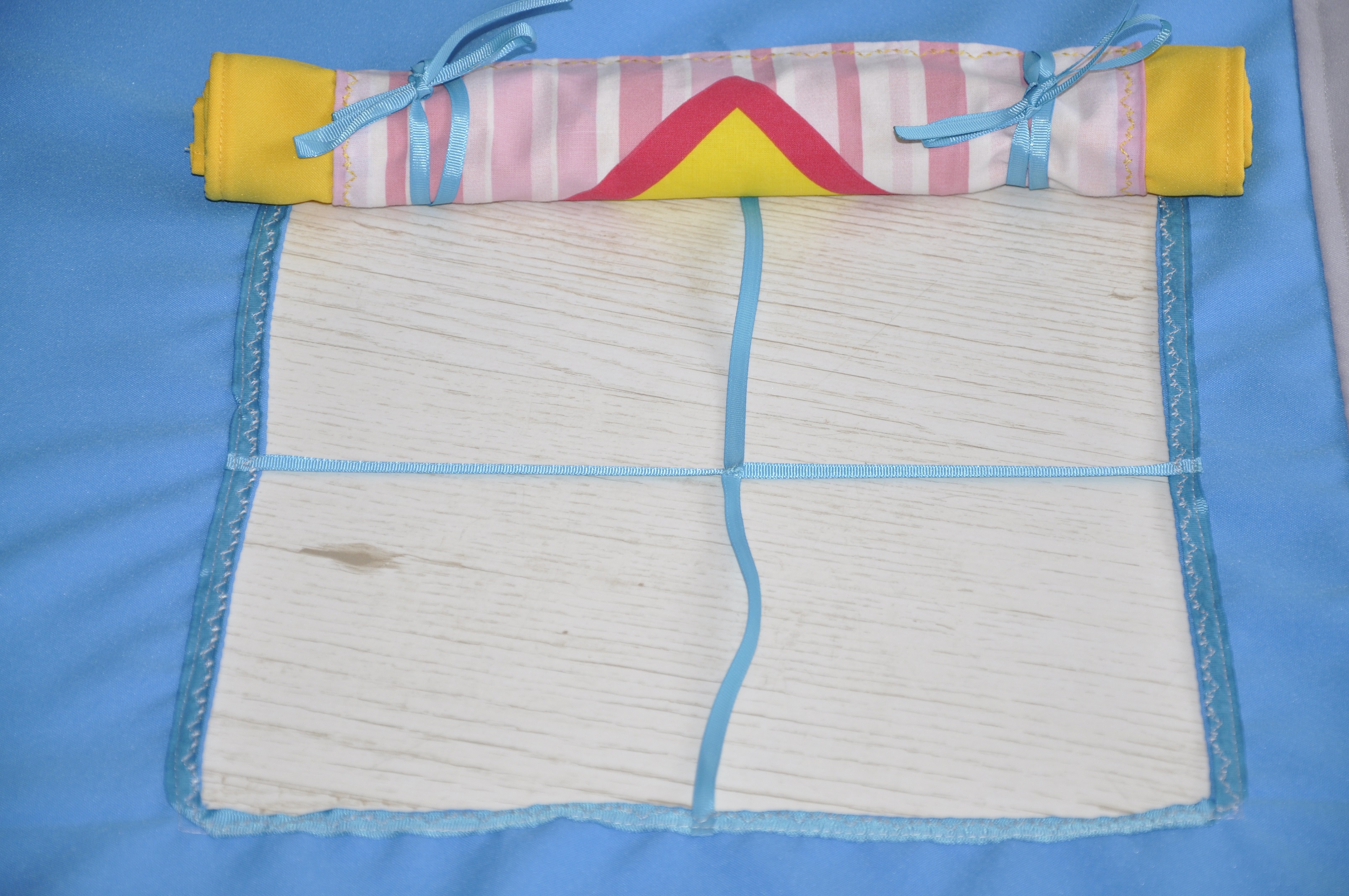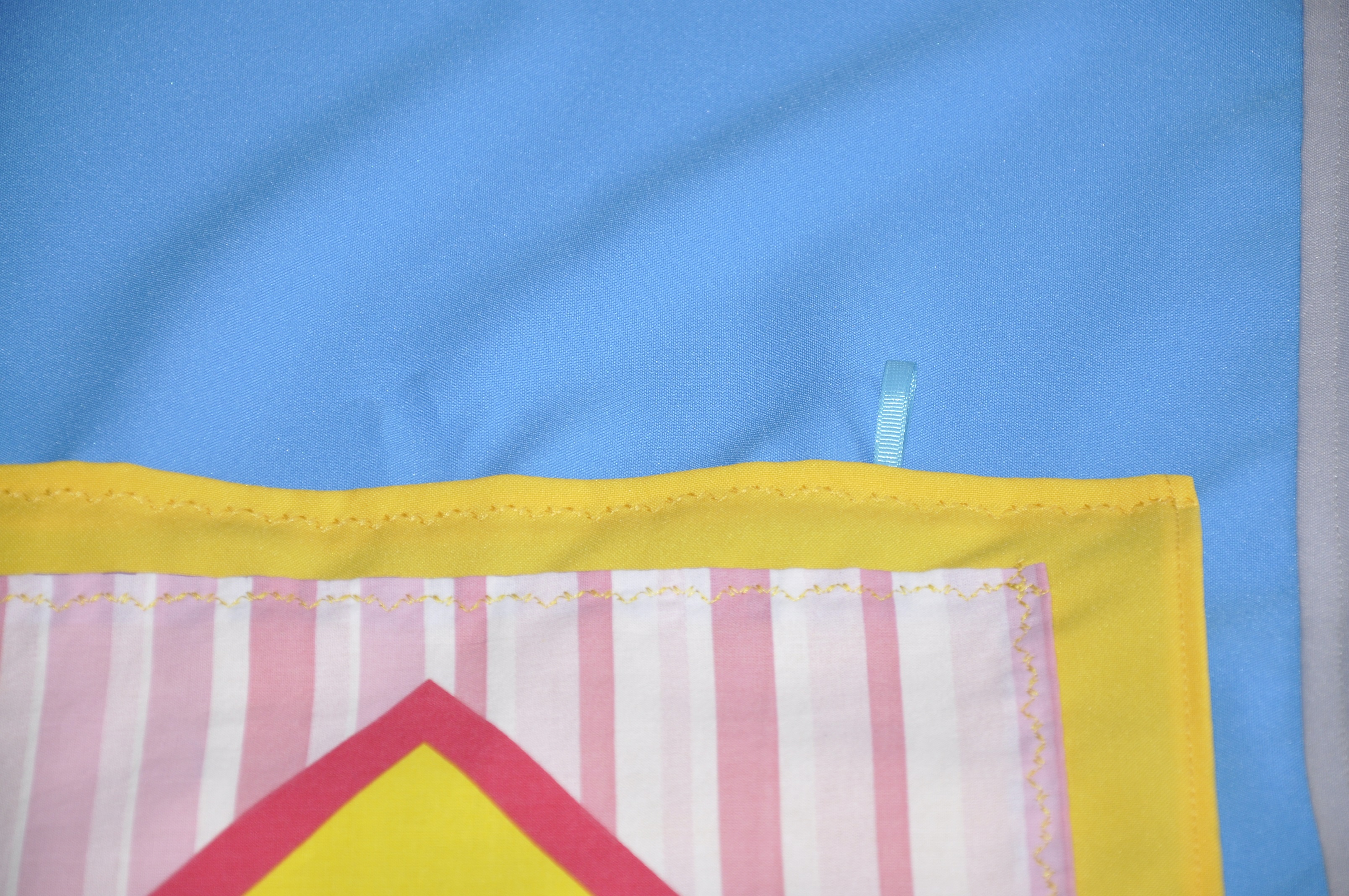 Właściciel firmy, która stworzyła to piękne łózko, zamontował pod łóżkiem stalową linkę, na której zawisła kotara, uszyta przeze mnie. Pokój jest niewielki więc kotara miała być w stonowanych ale wesołych barwach. Tak aby rozświetlić przestrzeń, a jej nie przytłoczyć. Kotara została zawieszona na metalowych „żabkach”, które da się zawiesić na lince już po zamontowaniu linki :p Dzięki temu łatwo będzie kotarę zdemontować do prania, albo zasunąć na jedna stronę gdy się znudzi 🙂