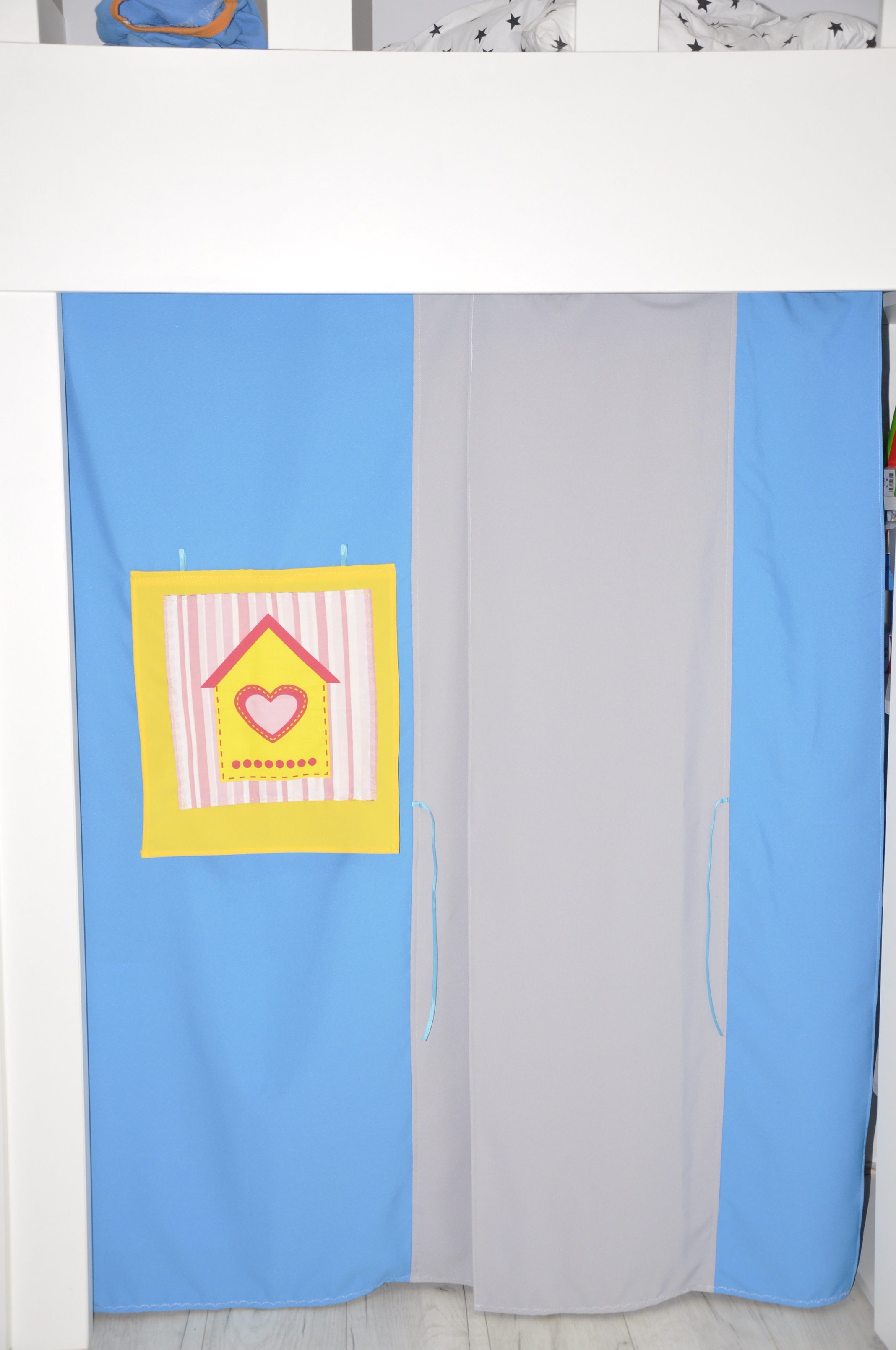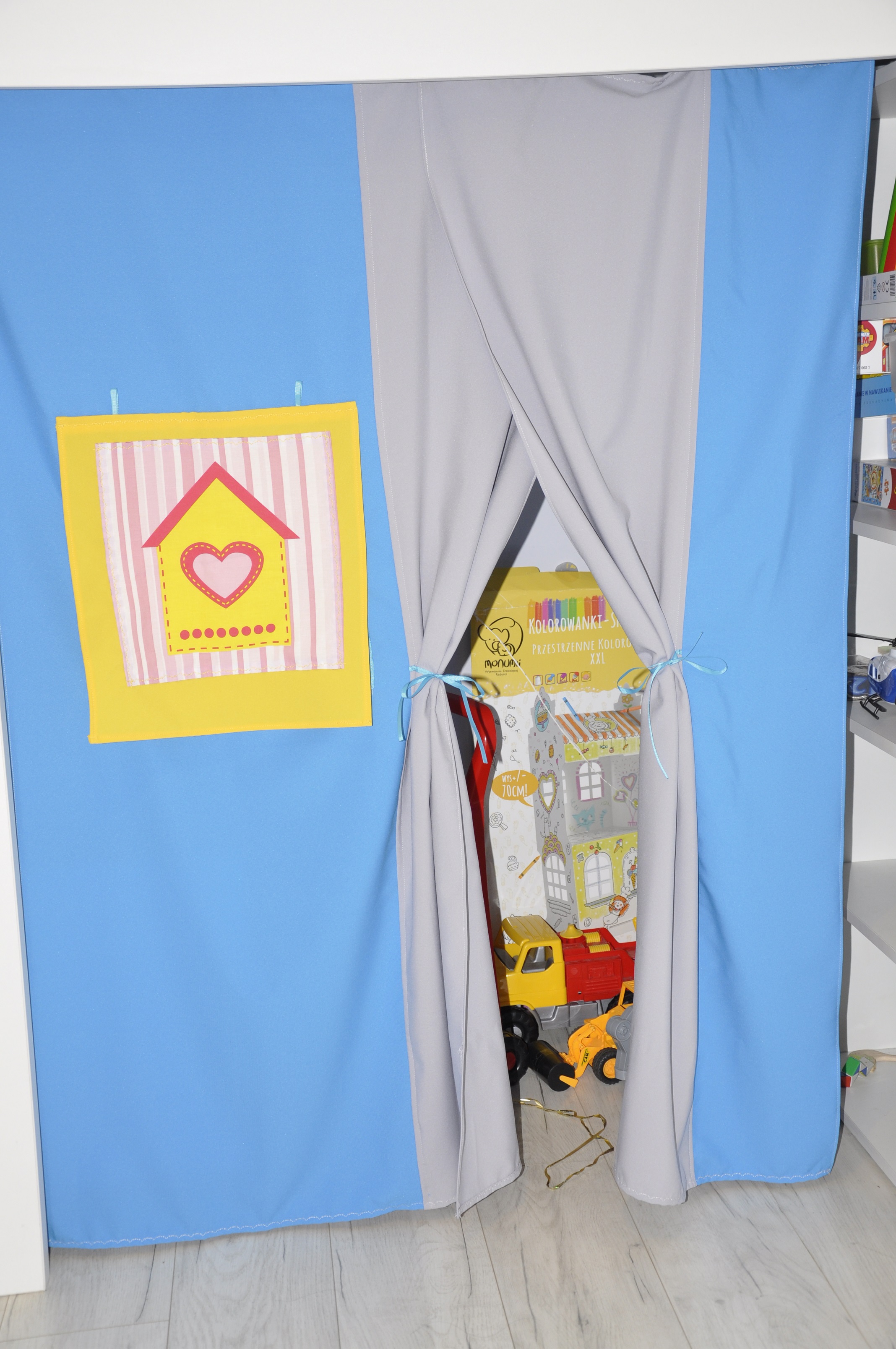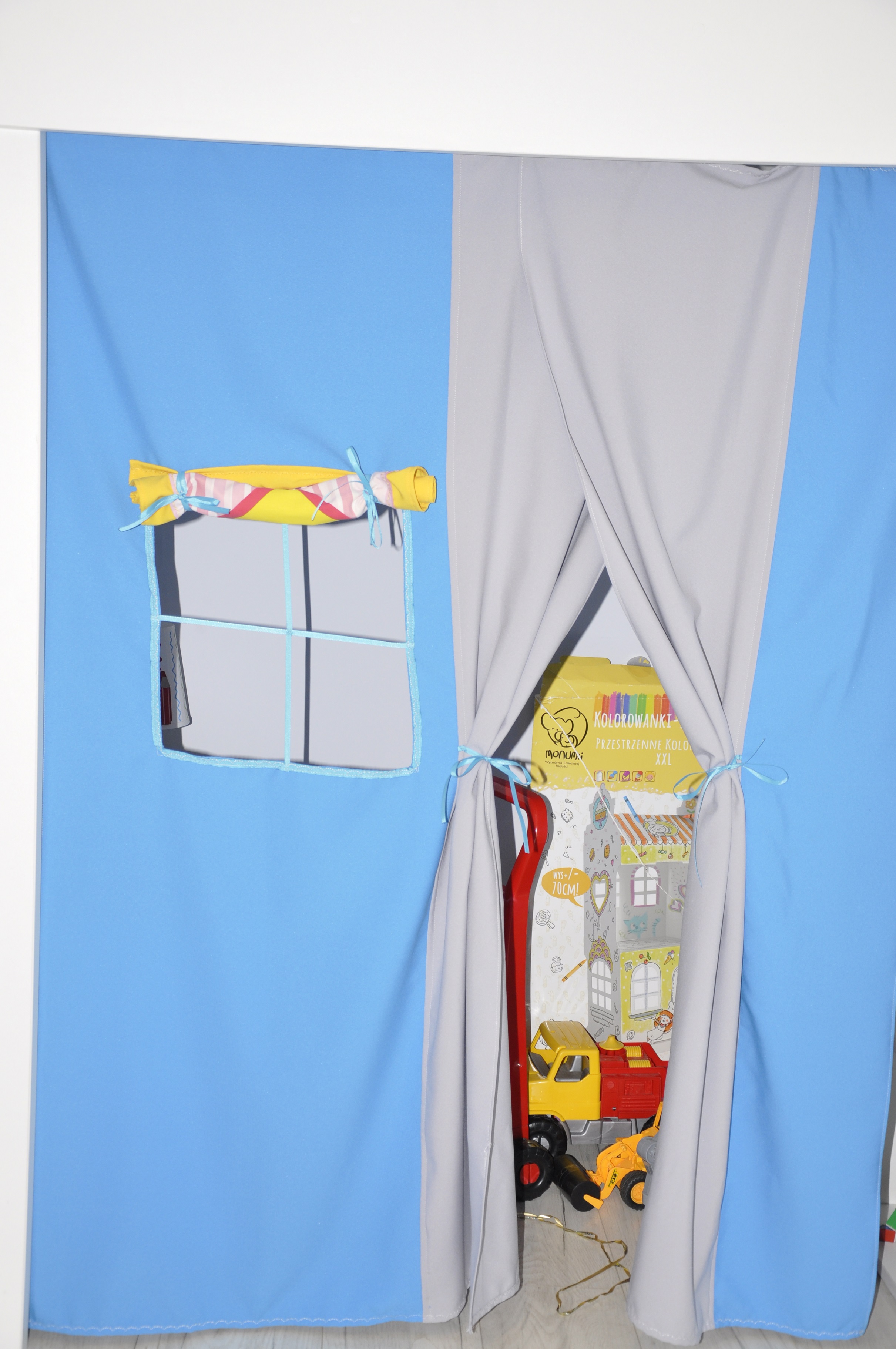 Kotara została uszyta z grubej, lejącej się tkaniny zasłonowej, na wymiar tak by idealnie pasowała pod łóżkiem. Została tak zaprojektowana, aby było wejście oraz okienko z roletą 🙂 teraz dziecko może bawić się w dom albo schować się gdy będzie chciało pobyć samo 🙂