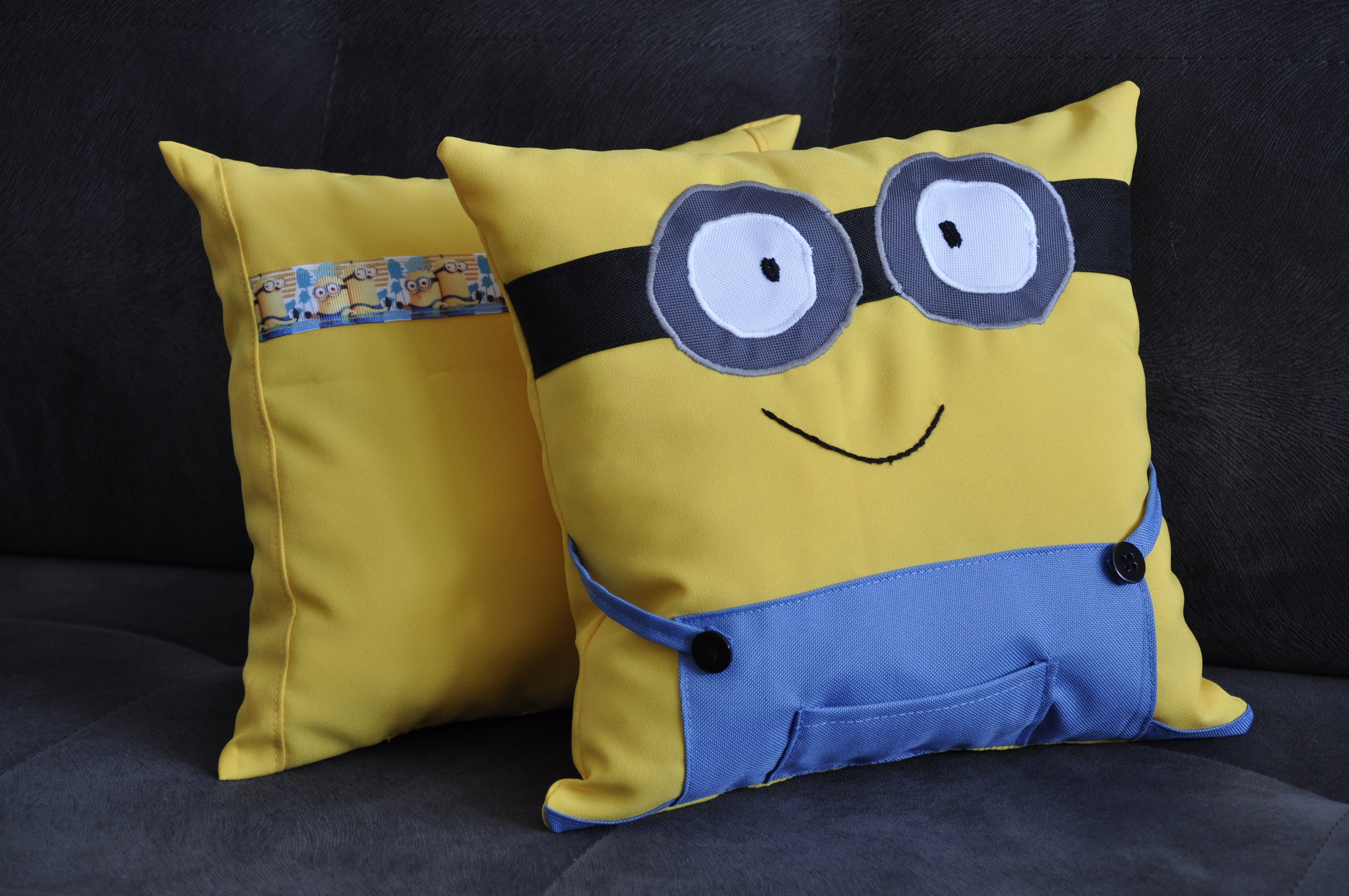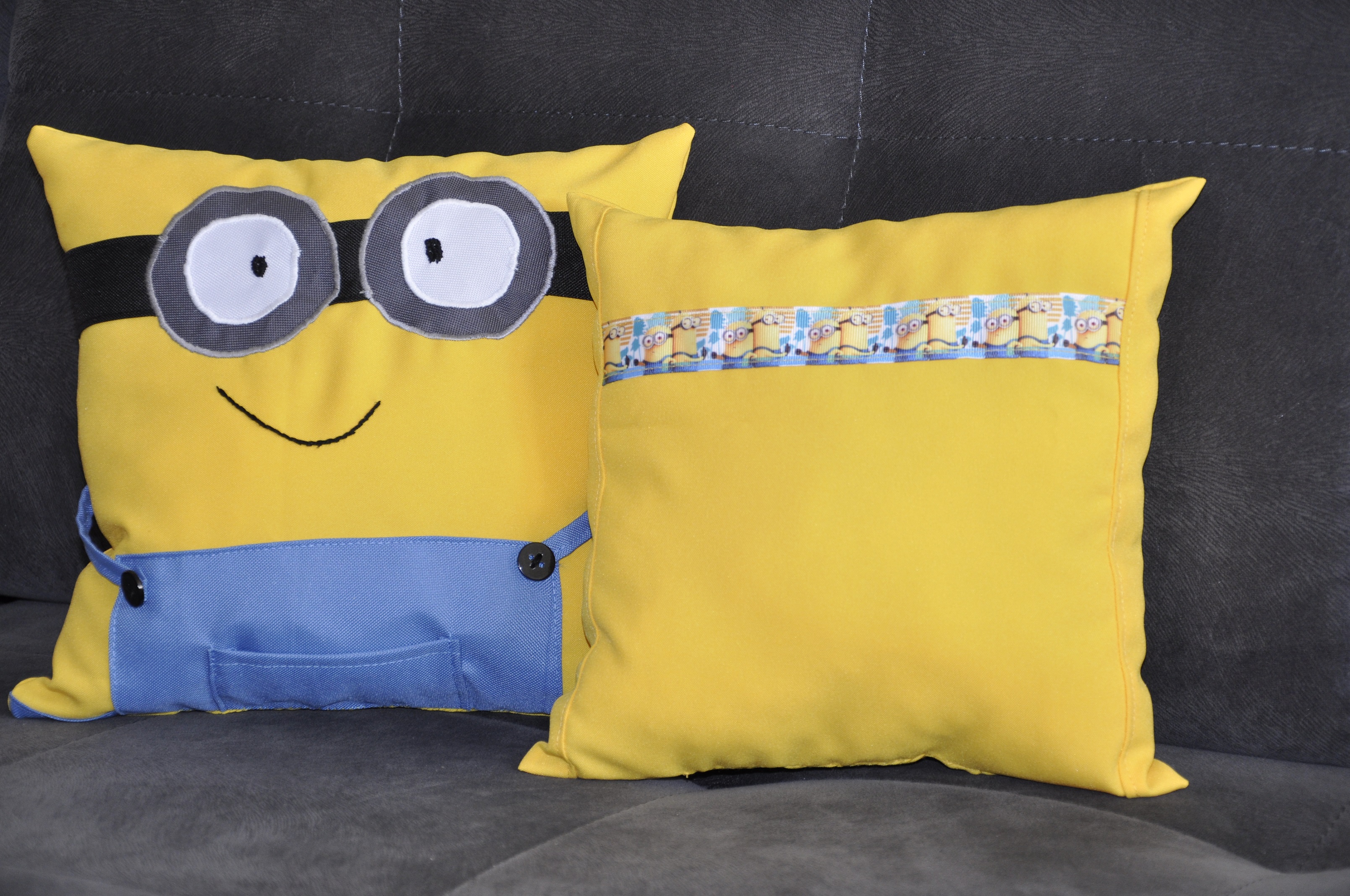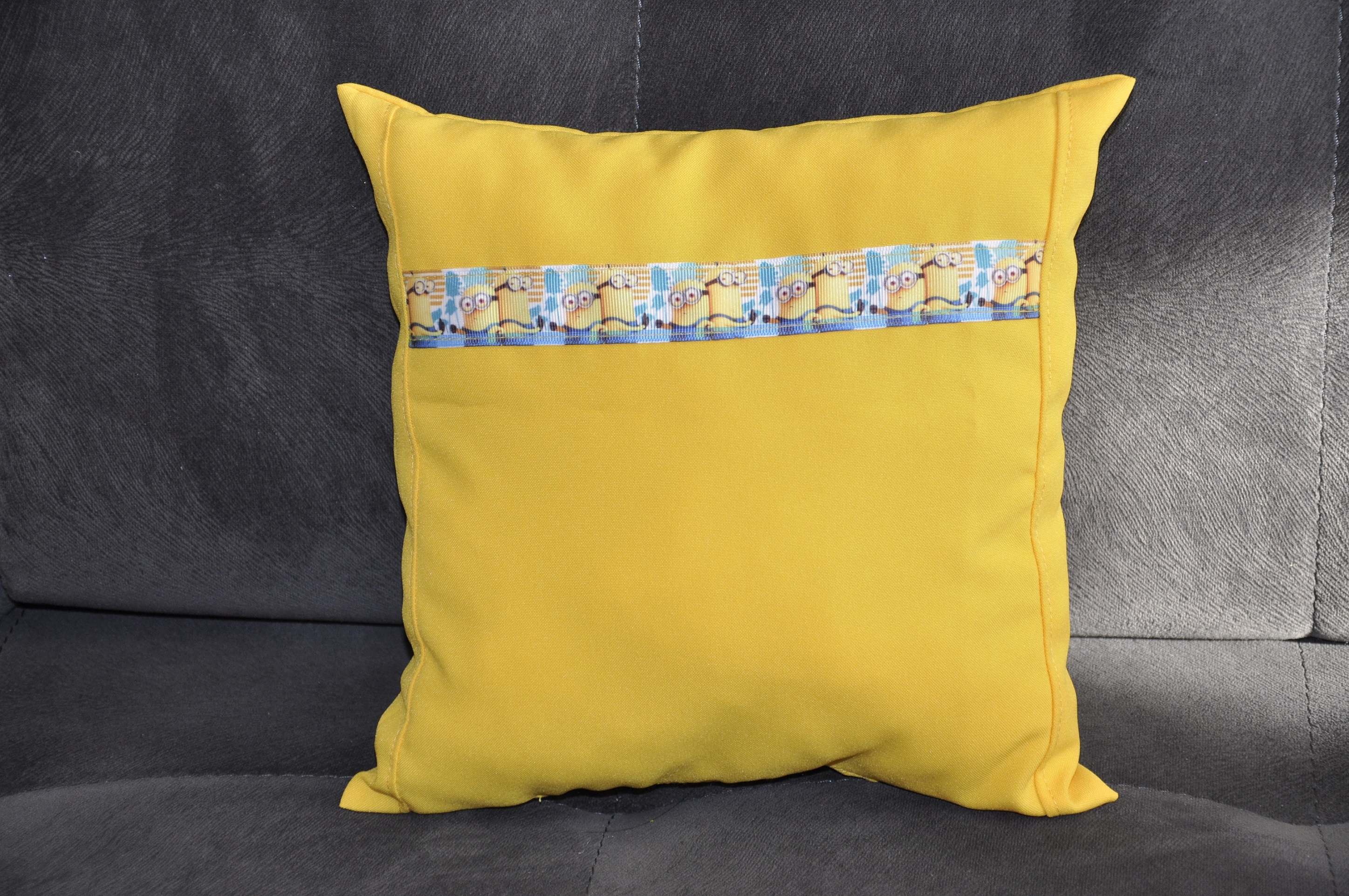 Do kompletu uszyłam jeszcze mniej skomplikowaną drugą żółtą podusię, wykorzystując jako aplikację resztkę taśmy rypsowej z Minionkami 🙂