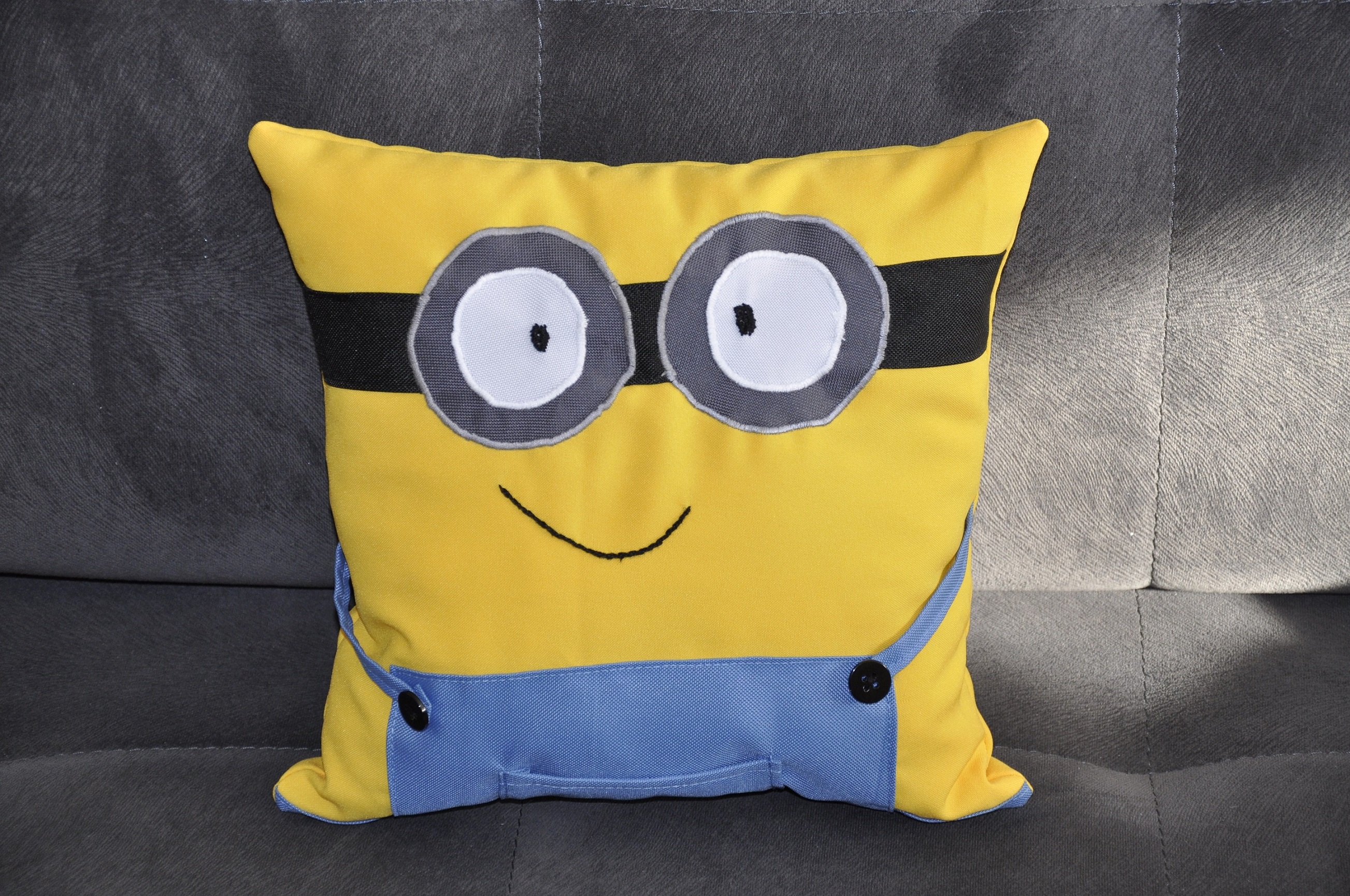 Jakiś czas temu szyłam przepiękną kotarę typu domek, do zawieszenia pod łóżko piętrowe i już wtedy widząc w zestawieniu tkaninę żółtą i niebieską miałam chętkę na uszycie poduszki przypominającej Minionka, ale nawał innych obowiązków nie pozwolił mi na to aż do teraz:)