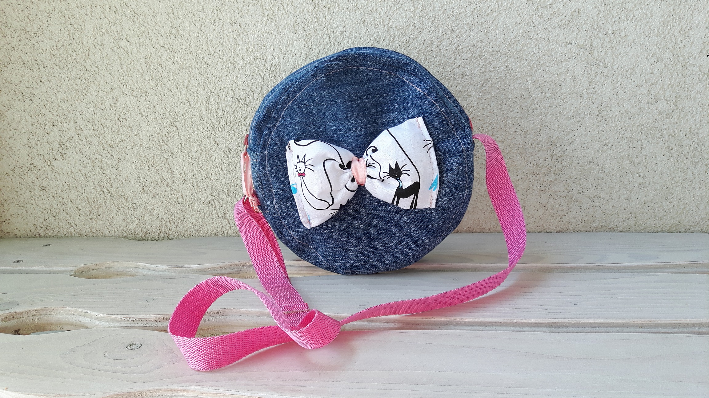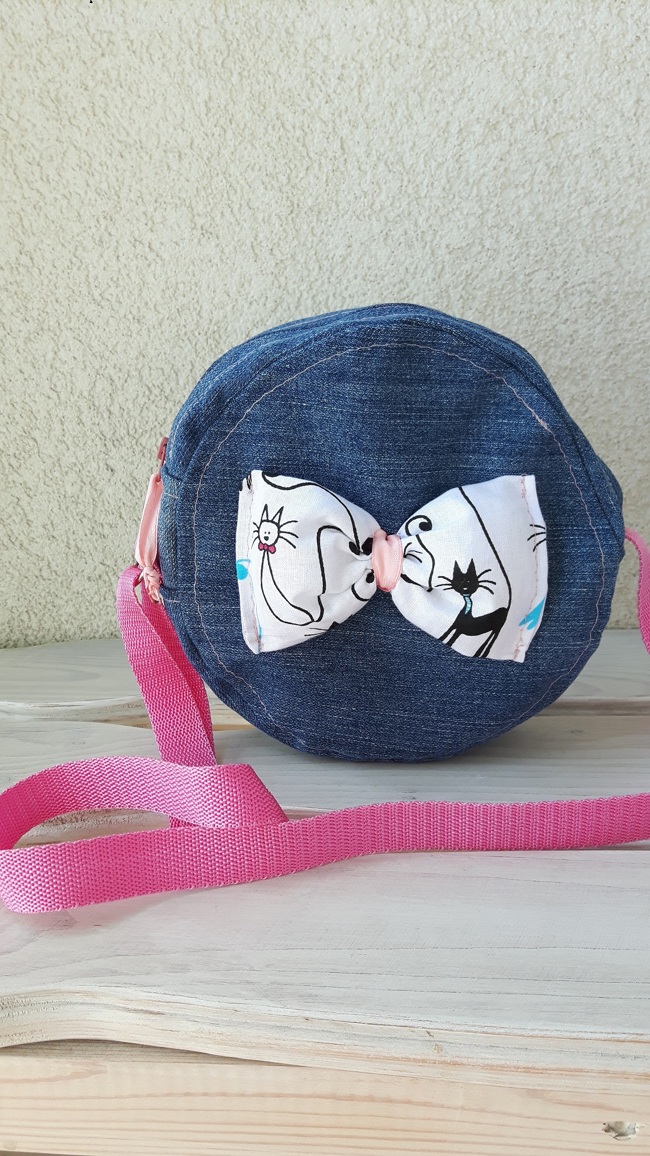 Chciałam, aby była jeansowa, okrągła, zapinana na zamek błyskawiczny i z regulowanym paskiem. Torebeczka jest niewielkich rozmiarów, ale pomieści laleczkę i/lub kilka innych drobiazgów. Ozdobiłam ją kokardką 3D.