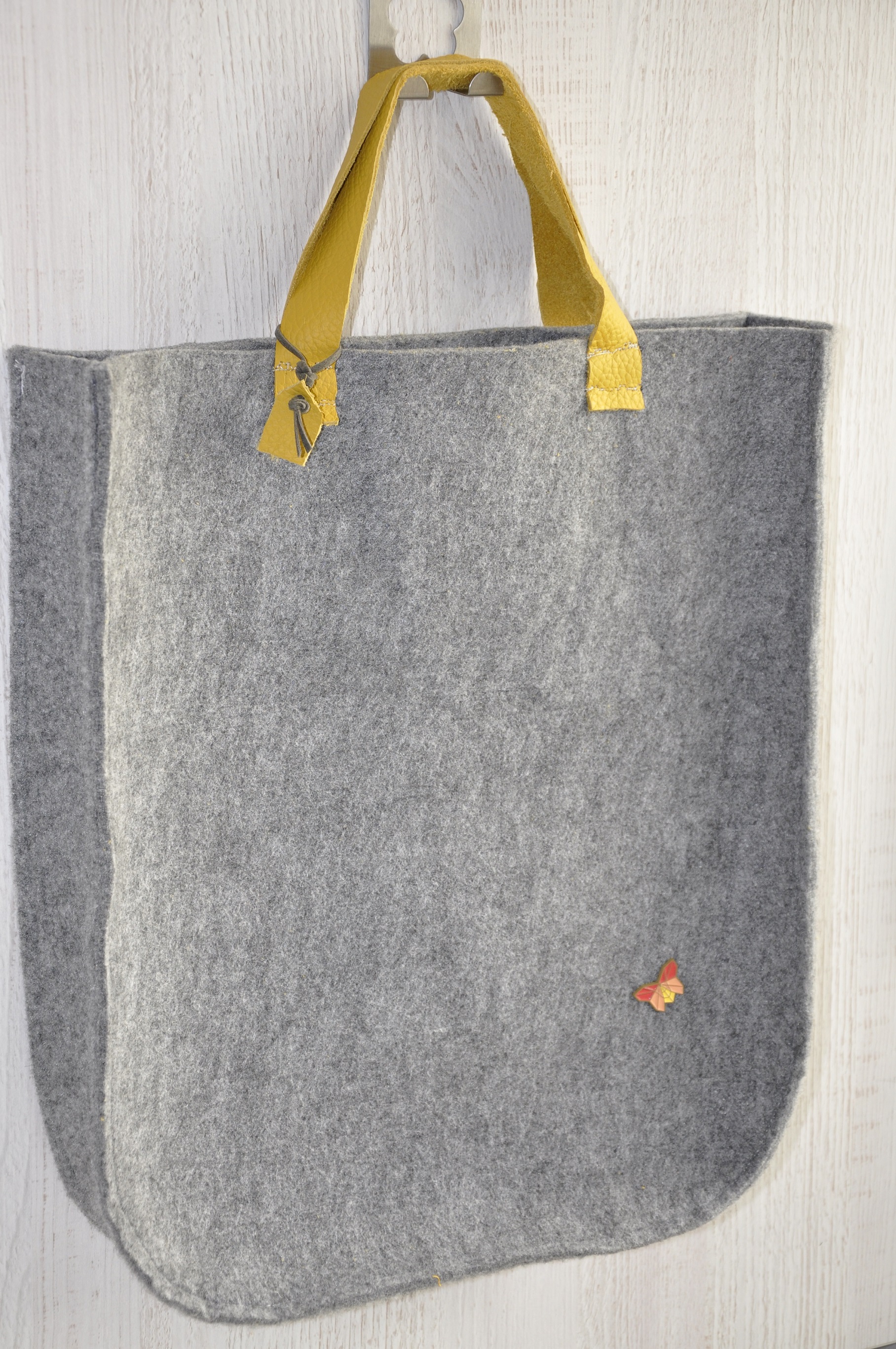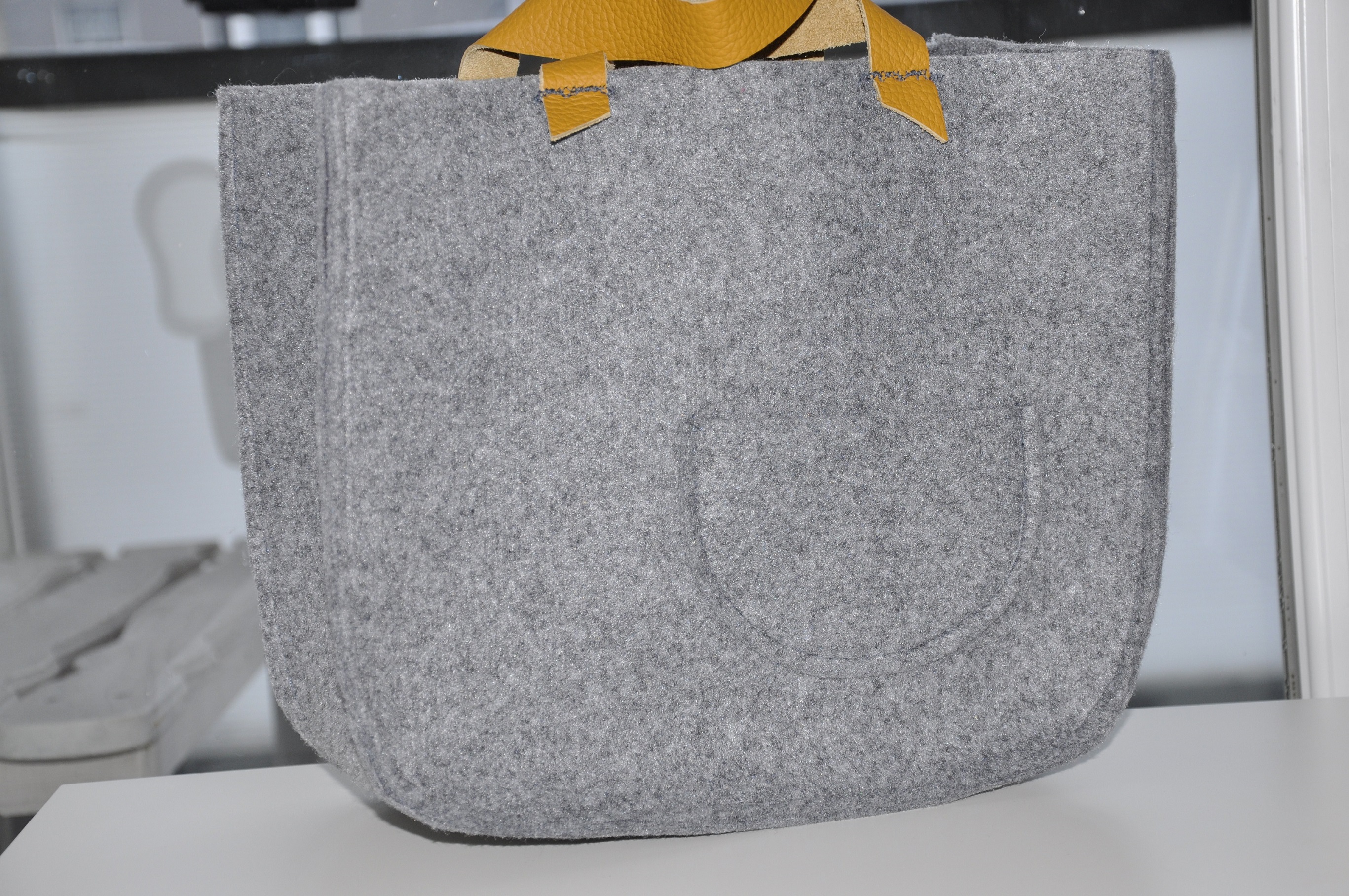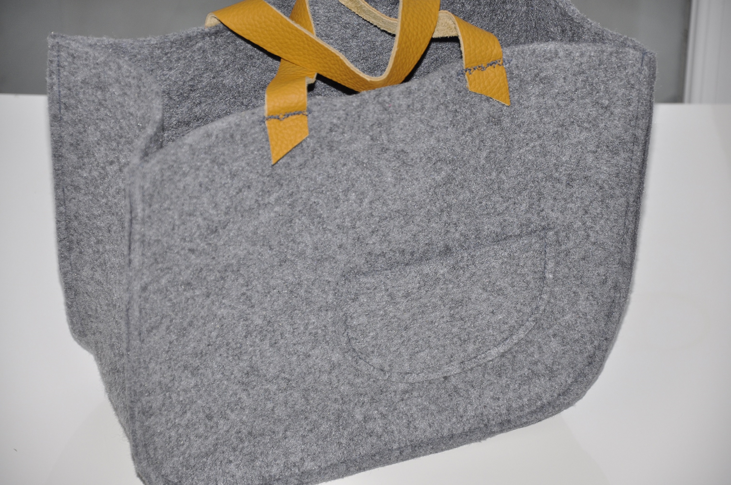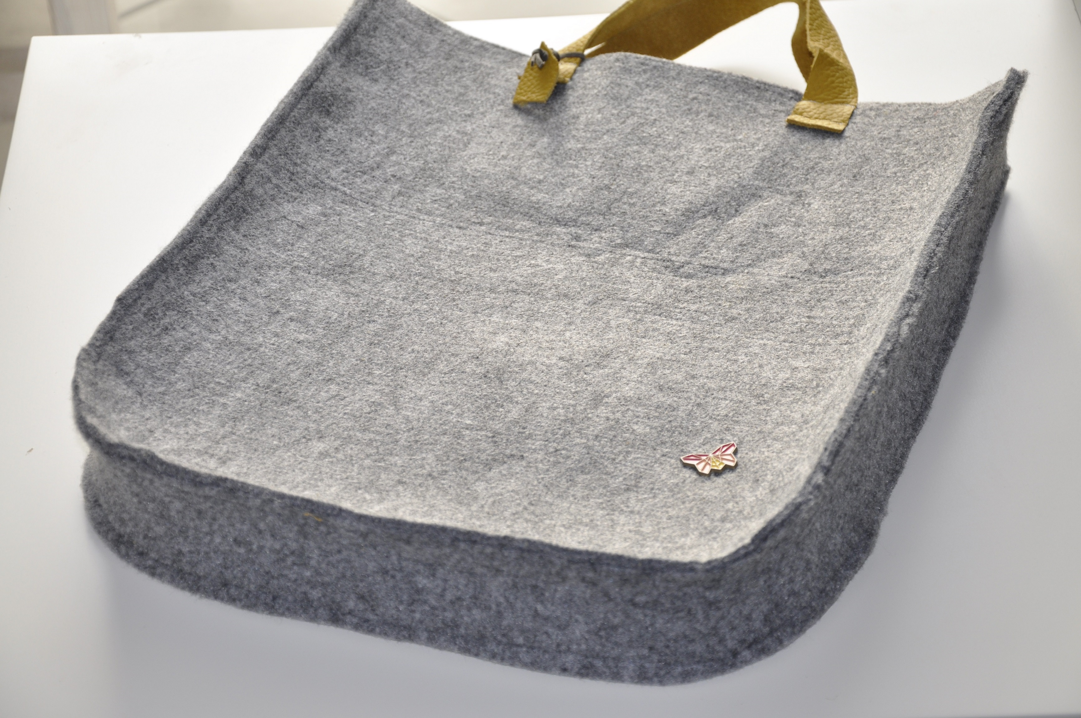 Tym razem pokusiłam się na dość sporych rozmiarów torbę z szarego filcu z rączkami ze skóry w pięknym musztardowo-miodowym kolorze. To jest tak zwana wielozadaniowa torba prezentowa 🙂 Tak dobrze przeczytaliście. Został w nią opakowany prezent urodzinowy z informacją, ze torba jest wielorazowego użytku, a że torba jest słusznych rozmiarów, to pomieści dokumenty i inne ważne rzeczy.