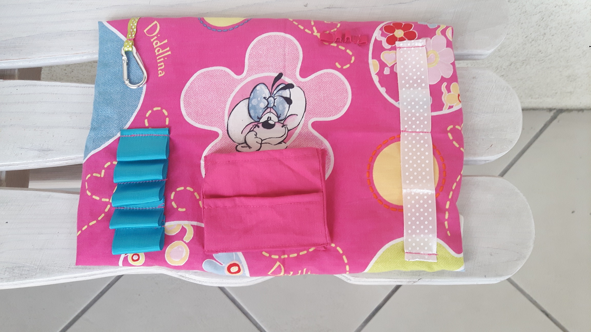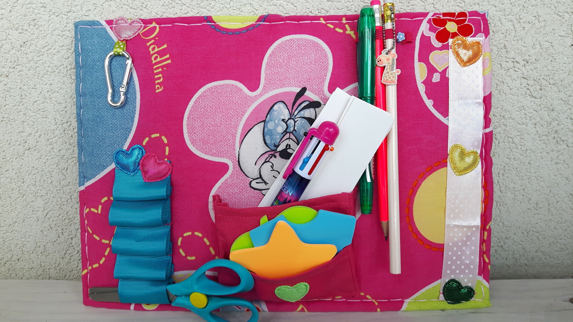 W pierwszej kolejności zaprojektowałam sobie jak ma wyglądać organizer, uwzględniając wielkość antyramki oraz to, do czego poszczególne elementy mogłyby być wykorzystane. Następnie przyszyłam kieszonki, tasiemki i gumkę. Podwinęłam materiał, aby tył prezentował się estetycznie.