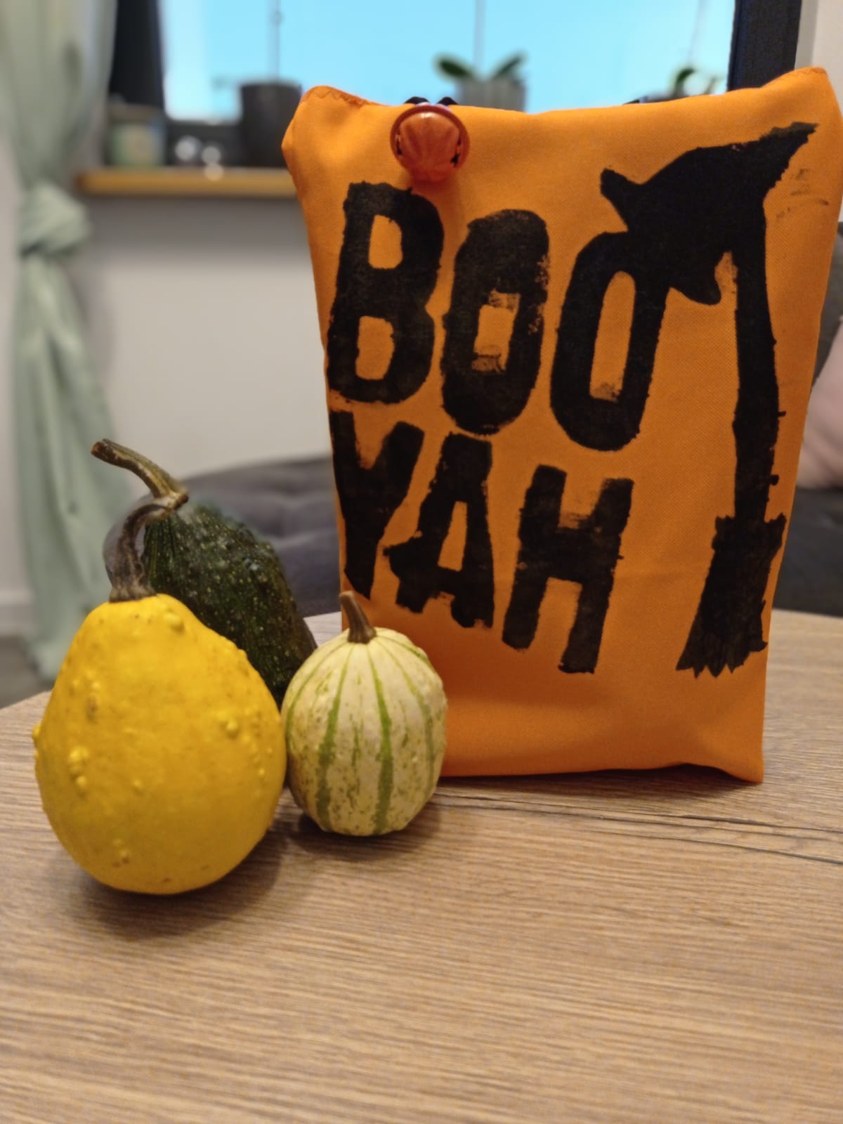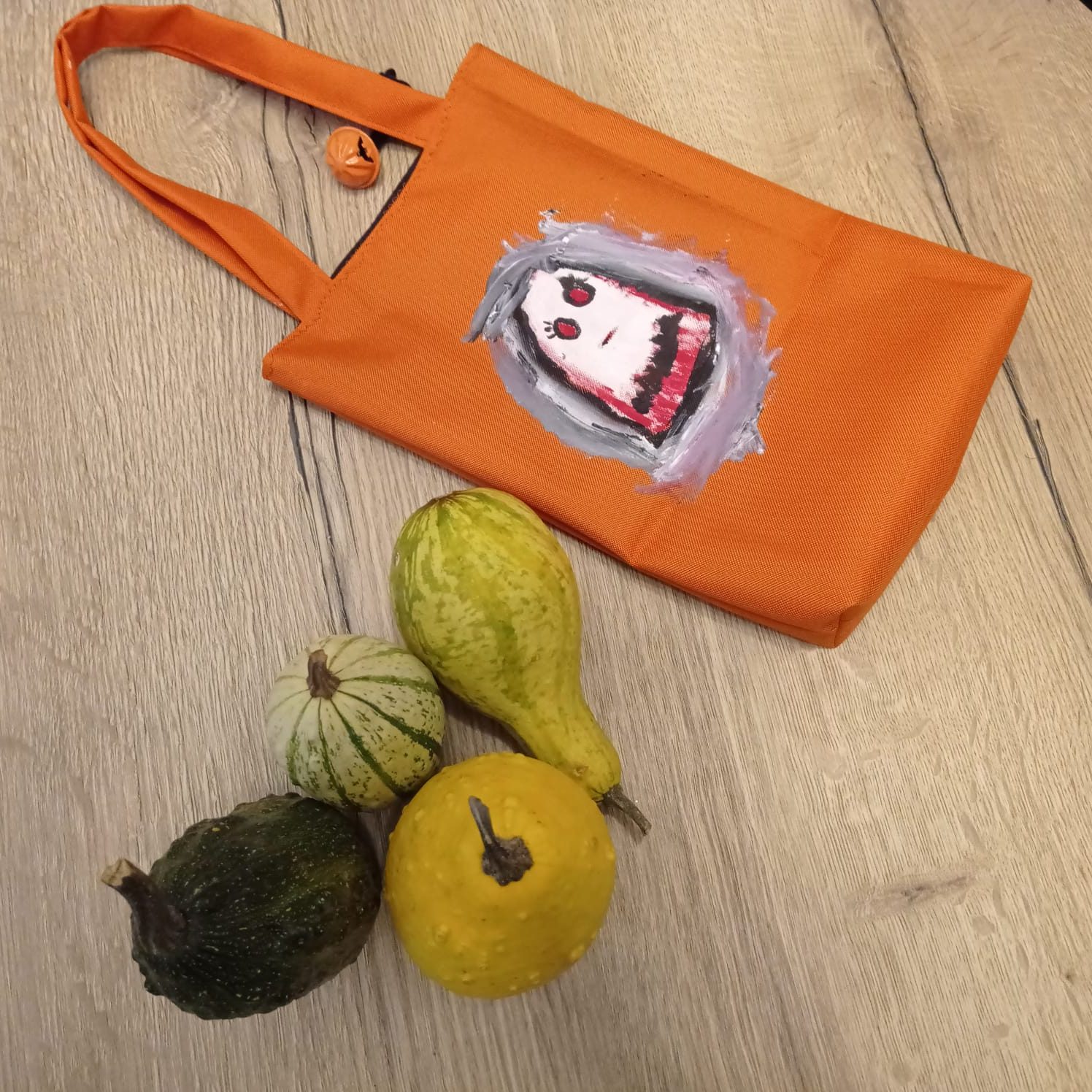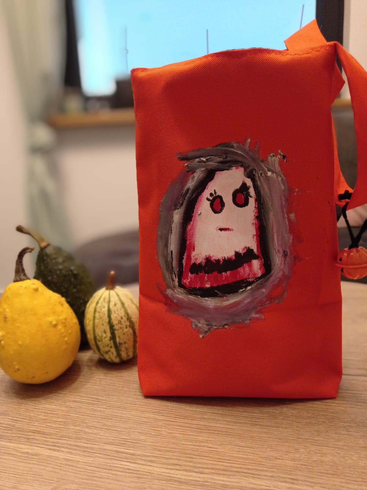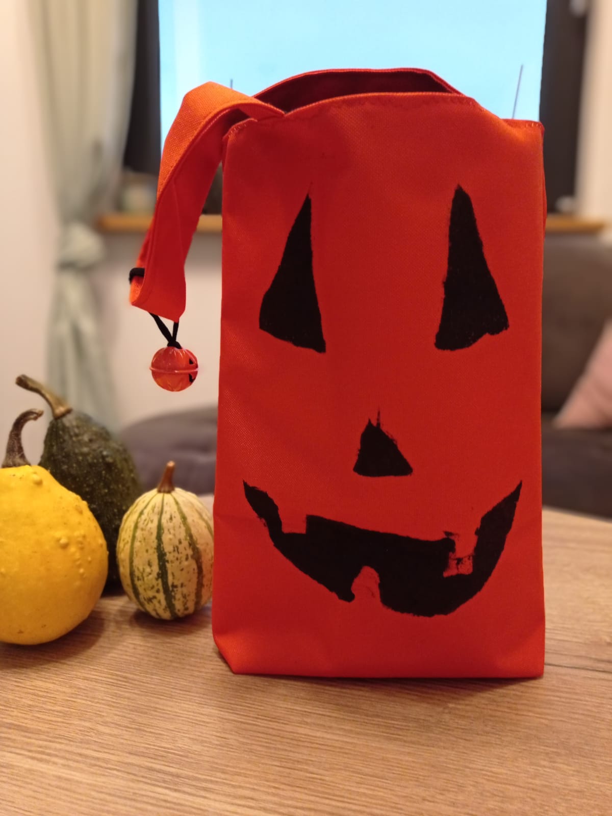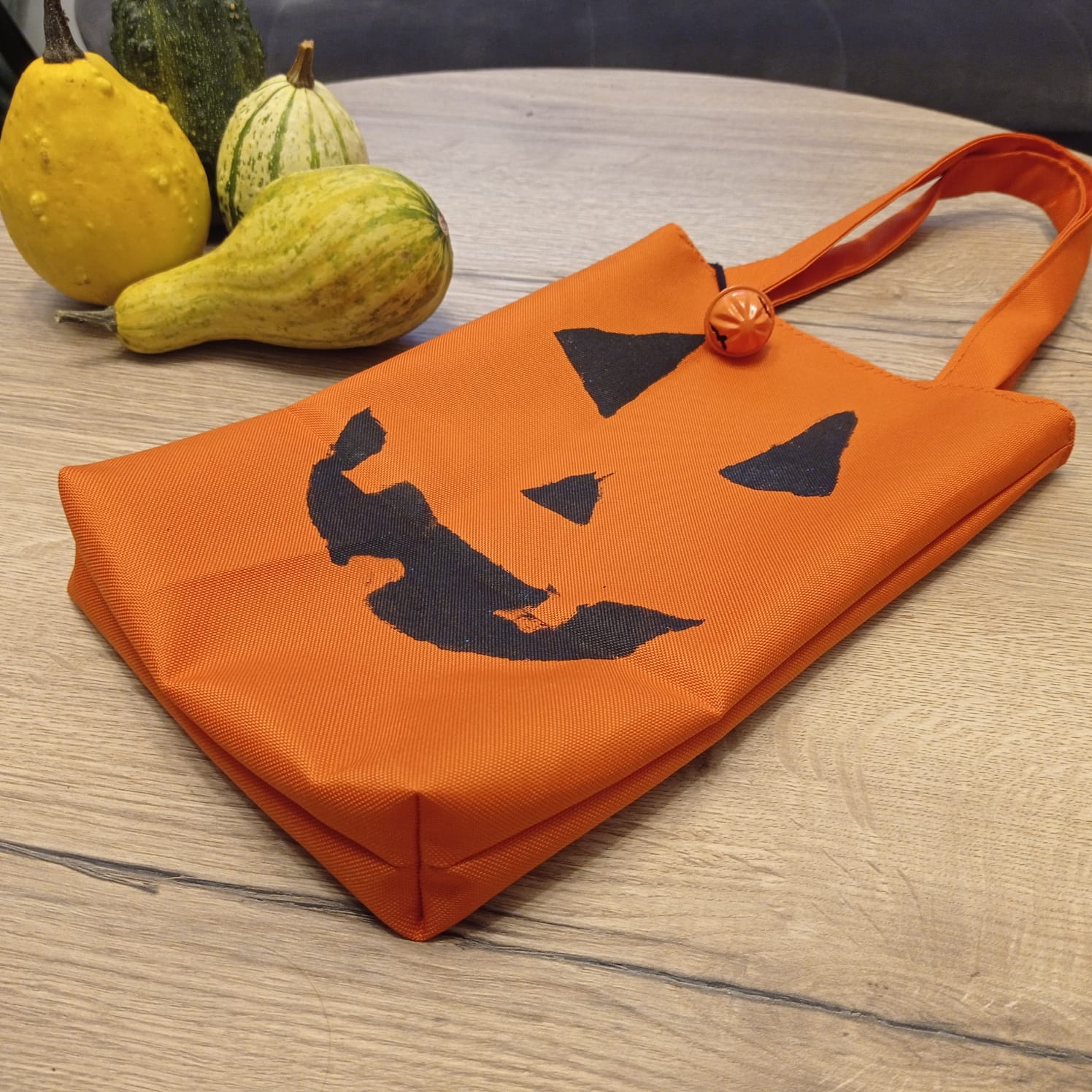 Na wspólne łowy cukierkowe, dziewczyny umówiły się z koleżankami, więc ja na tą okazję, na szybko uszyłam im odpowiednie torebki na łakocie. Miałam dwa odcienie pomarańczowej tkaniny wodoodpornej typu oxford. dziewczynki użyły farbek do tkanin i samodzielnie ozdobiły, każda swoja torbę.