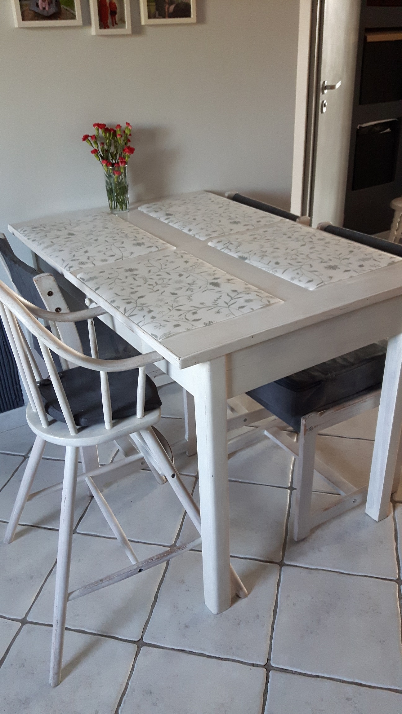 Z racji tego, że posiadamy wielofunkcyjne pomieszczenie w skład, którego wchodzi przedpokój, kuchnia, jadalnia, biuro i plac zabaw – a to wszystko na ok 15 m kwadratowych, zatem wokół stołu nie ma zbyt wiele miejsca. Przy nim mieszczą się tylko cztery krzesła -jedno stoi na stałe nieopodal przy biurku i dostawiane jest do stołu w razie potrzeby 🙂