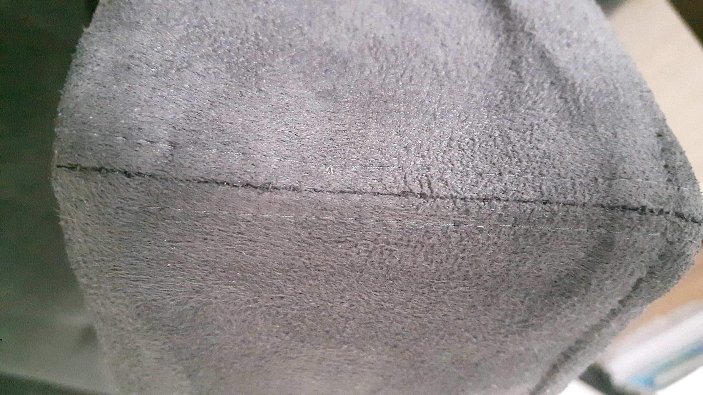 Tkanina, którą obite są krzesła to ALCANTRA w kolorze ciemno szarym– wytrzymała, łatwo się ją czyści, odporna na zabrudzenia – w zasadzie to zdecydowało o jej wyborze. Wystarczyło dokupić nici w odpowiednim odcieniu oraz zamek błyskawiczny, aby w razie potrzeby można było łatwo ściągnąć poszycie i je uprać.