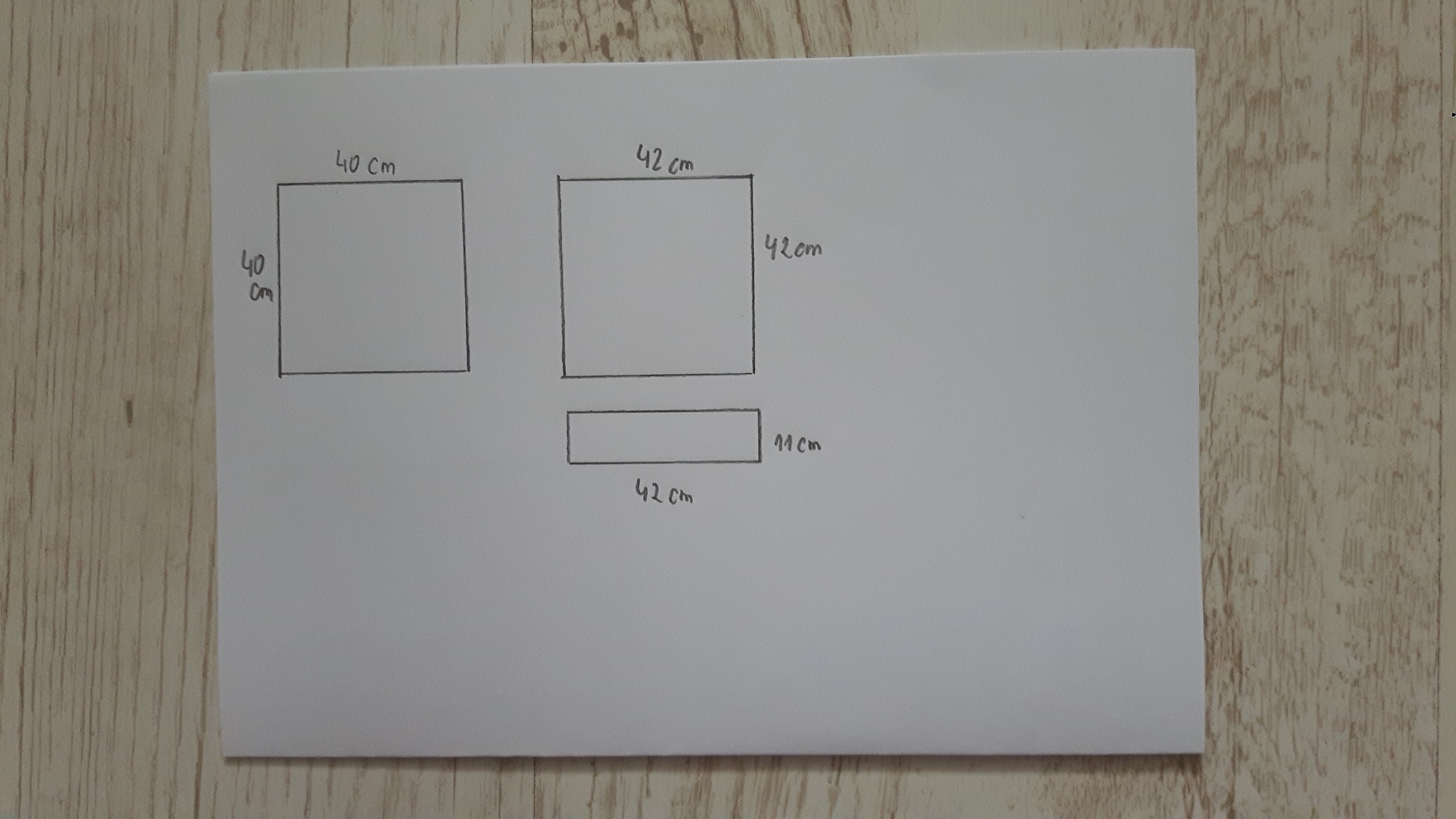 Jeśli nie masz wprawy, to najwygodniej będzie Ci wykonać gotowe szablony z bristolu. Wystarczy jeden szablon w każdym wymiarze. Następnie umieść każdy szablon na materiał i odrysuj kredką krawiecką dwa kwadraty o wymiarach 40×40 cm na piance krawieckiej (moja pianka poliuretanowa jest w rozmiarze 40×40 cm), dwa kwadraty o wymiarach 42×42 cm oraz cztery prostokąty o wymiarach 42×11 cm na tkaninie.