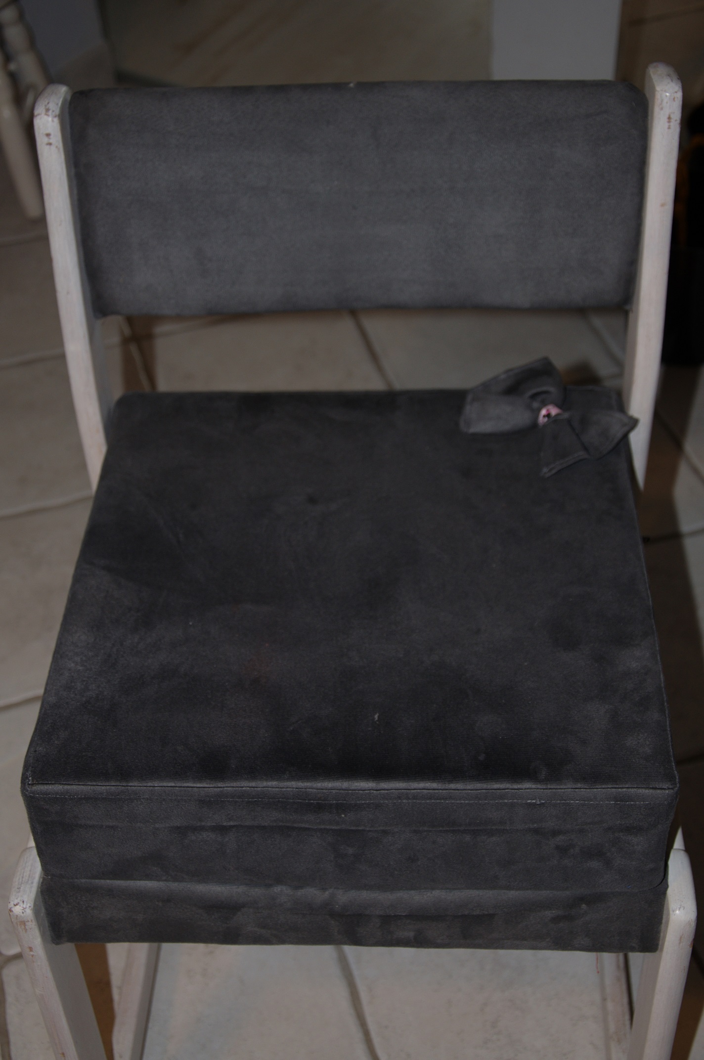 Na koniec uszyłam kokardkę, którą już ręcznie przyszyłam do prawego górnego rogu siedziska, tak aby nie przeszkadzała w siedzeniu. Oczywiście nie musiało jej tam być, ale podkreśliła charakter krzesła, a dodatkowo współgra z krzesełkiem dla młodszej córki, które ma szarą poduszkę z kokardką 🙂