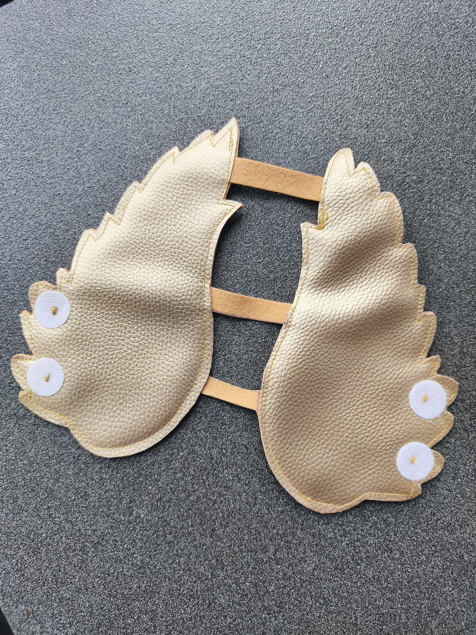 Sukienkę uszyłam dokładnie według jej projektu. To ona decydowała o kroju, detalach i charakterze stroju, a ja starałam się jak najlepiej przełożyć jej pomysł na rzeczywistość. Do tego powstała opaska ze skrzydłami oraz skrzydła oplatające nogę – subtelne, ale robiące efekt „wow”.