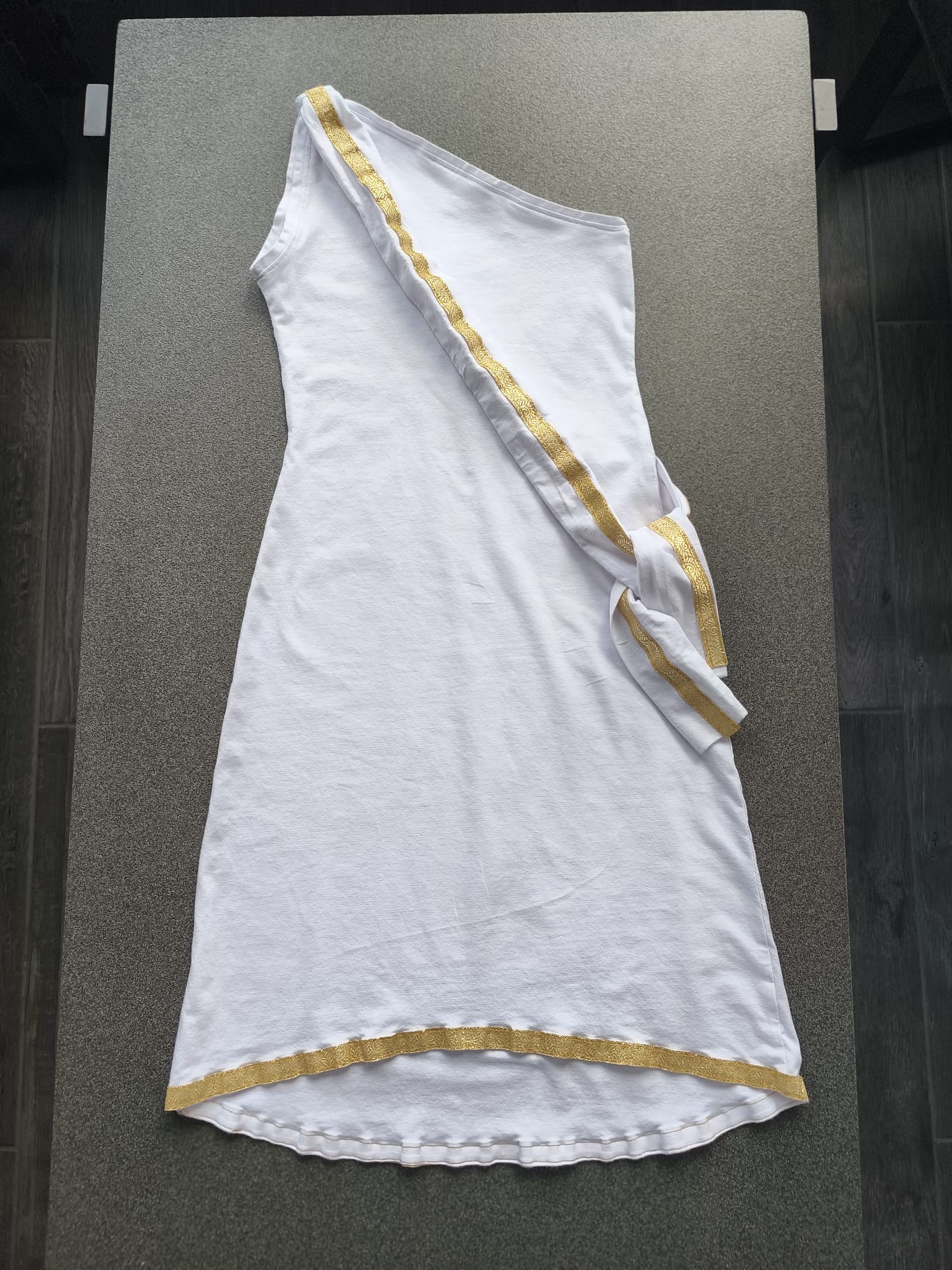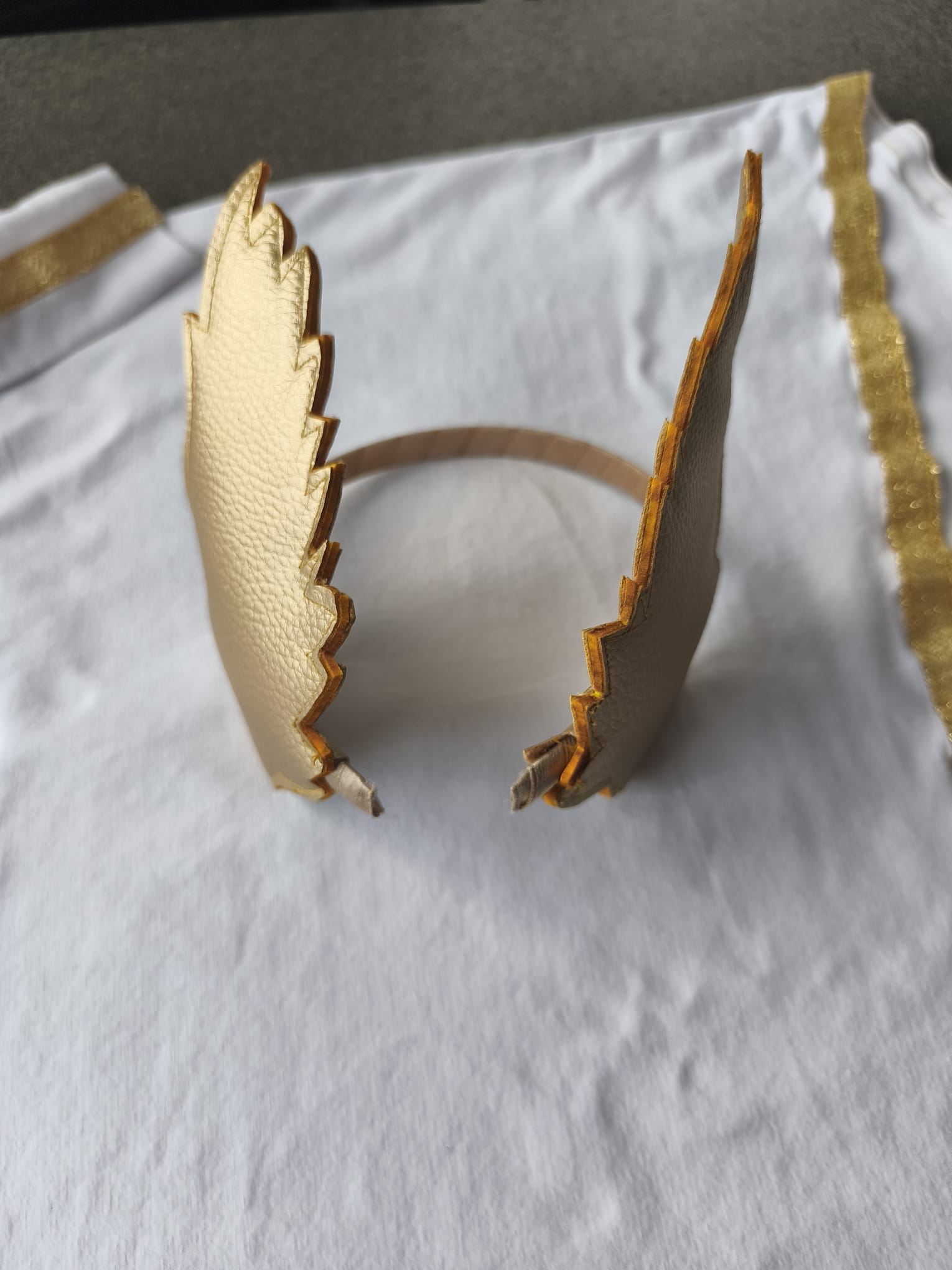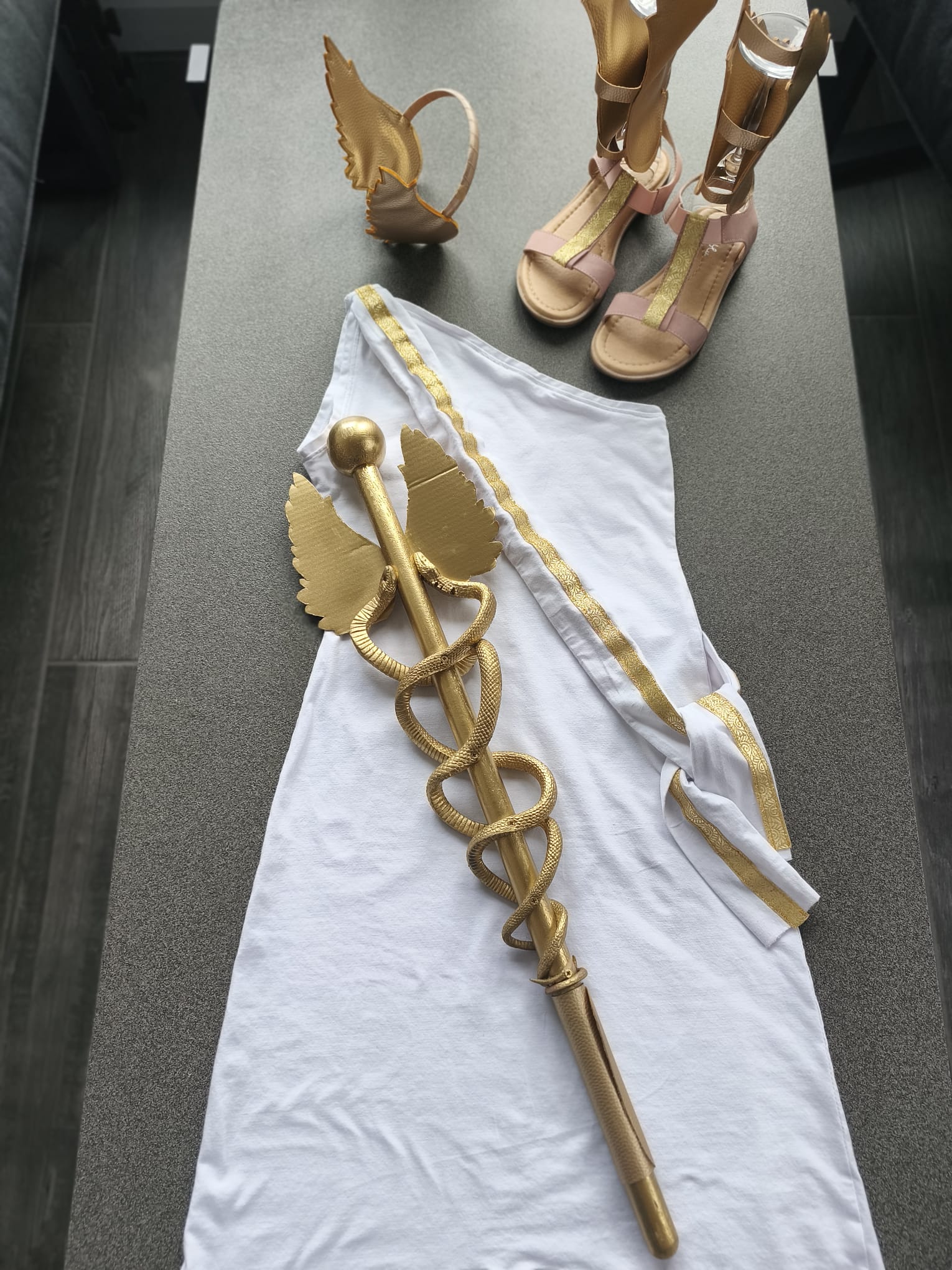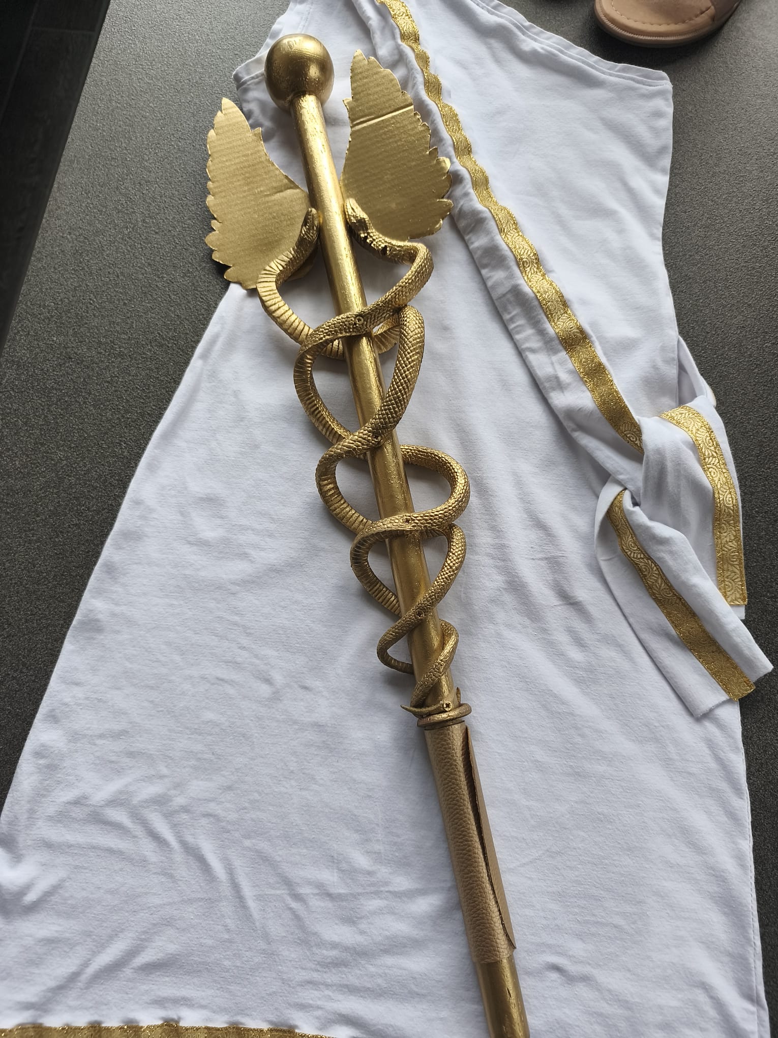 Nie mogło oczywiście zabraknąć kaduceusza – jednego z najważniejszych atrybutów Hermesa. Pomysł był mój, ale wykonanie to już zasługa mojego męża 💛 Stworzył go z gumowych węży oplatających kijek, a całość wykończył złotym sprayem. Efekt wyszedł naprawdę świetny i idealnie dopełnił cały kostium.
